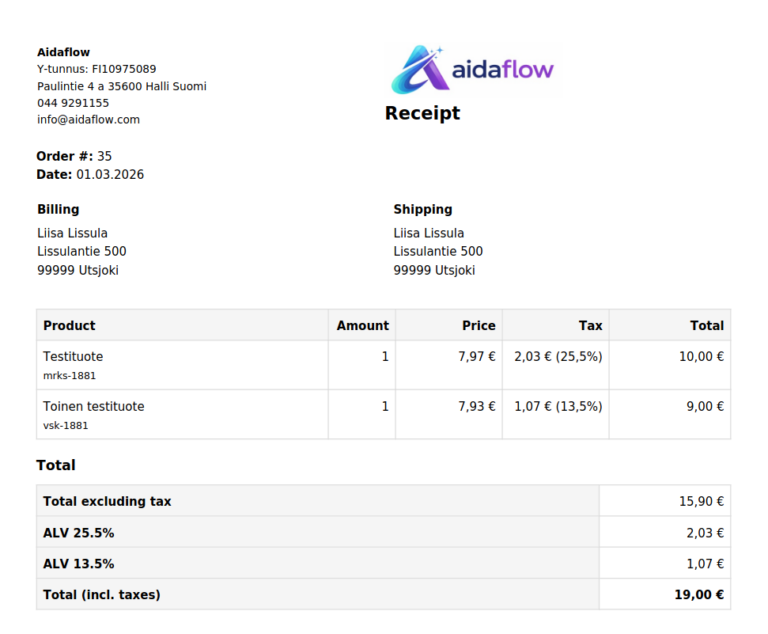 Print receipts directly from orders, attach them to emails, or let customers download receipts from the order confirmation page.